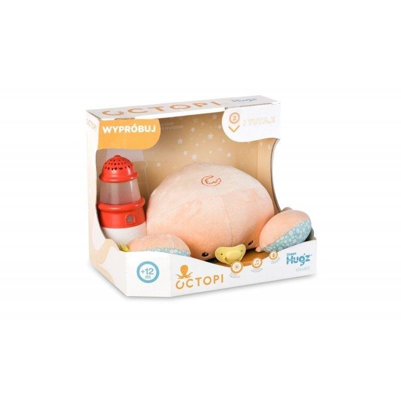 Ocean Hugz - Maskotka Wielorybek i Projektor Latarnia Morska DKM6869. Gdy przytulisz pluszaka, latarnia morska zaczyna grać kołysanki i świecić. Możliwe jest również włączenie samej latarni morskiej, bez konieczności przytulania pluszaka. Latarnia Morska gra kołysanki, świeci delikatnym światłem i wyświetla gwiazdki na suficie. Posiada okrągłą podstawę, dzięki której może się delikatnie kołysać. Ośmiorniczka w kolorze fioletowym posiada żółty, plastikowy smoczek. Latarnia rozświetli pokój i ukołysze Twoje dziecko do snu.