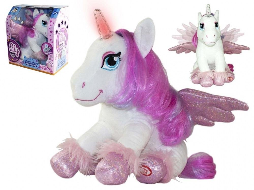 Jednorożec posiada świecący róg różnymi kolorami, ruchome i świecące skrzydła, melodie i dźwięki jak czarodziejska róźdżka, wielobarwne włosy, szczoteczka do czesania.
