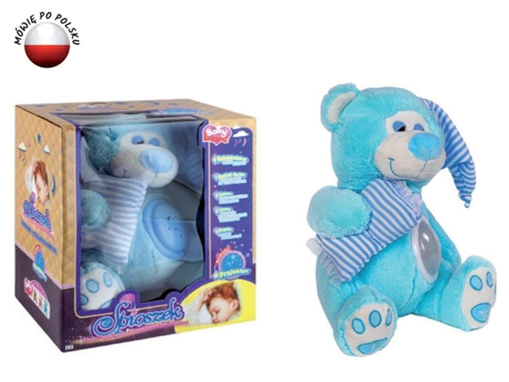 MIŚ ŚPIOSZEK niebieski b/o wysokośc ok. 30 cm. Zabawka ma uspakajający wpływ na małe dzieci. Sprawdza się doskonale jako pomoc w usypianiu. Łagodnym, kobiecym głosem śpiewa 4 polskie kołysanki. Przytulanka ma wbudowaną lampkę z projektorem