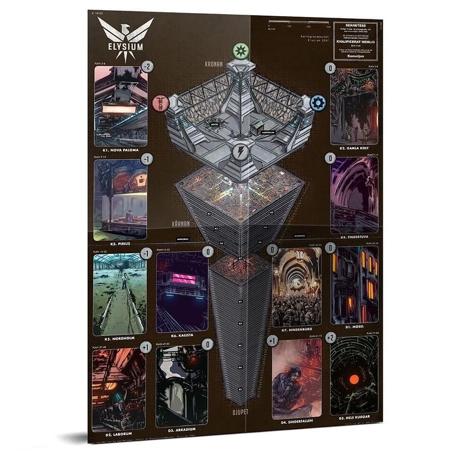 Vekoformátová barevná mapa podzemního města Elysium ze hry Mutant: Elysium RPG. Velikost mapy 39.5 cm x 55.8 cm. číst celé