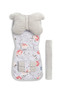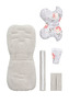Komplet deluxe składa się z dwustronnej wkładki do wózka, poduszki motylek oraz nakładek na pałąk i pasy. Zarówno wkładka jak i poduszka, z jednej strony obszyte są bawełną 100%, a z drugiej posiadają miły w dotyku materiał. Wkładka jest miękka, ale jednocześnie nie spłyca siedziska. Przeznaczona do wózków spacerowych i głębokich, posiada otwory na pasy dzięki czemu pasuje do każdego wózka. Oprócz pełnienia praktycznej funkcji ochrony przed zabrudzeniami i poprawy komfortu podróżowania, komplet ożywi wnętrze wózka nadając mu wyrazisty charakter.