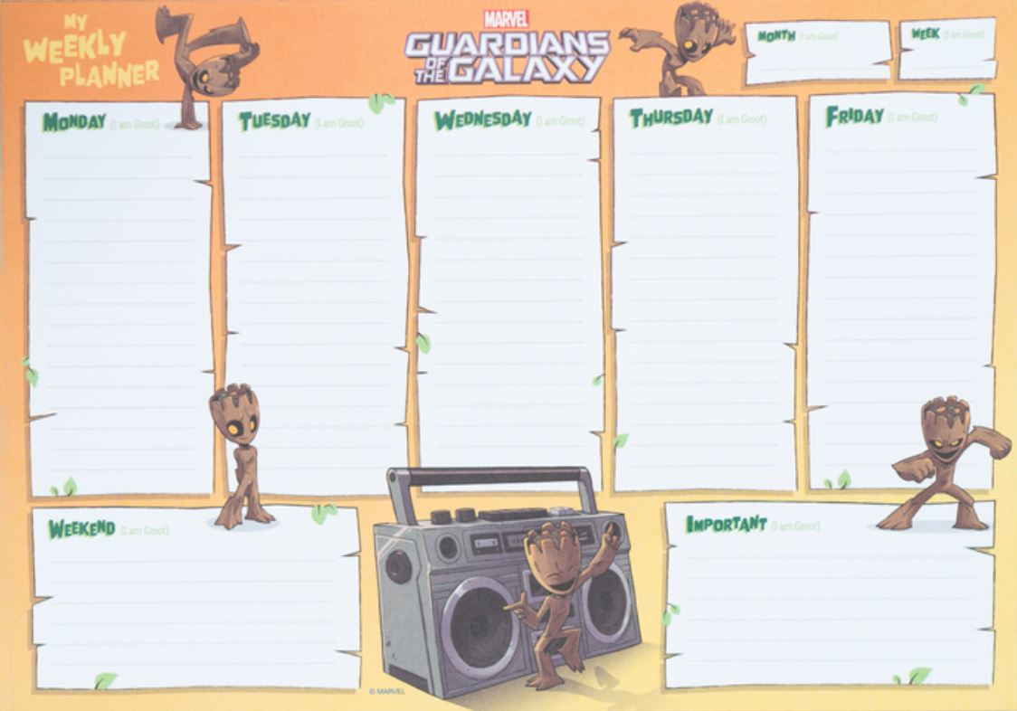 Stolní týdenní plánovací blok s 54 listy na všech 12 měsíců, inspirovaný filmem Strážci Galaxie. Vhodné také jako podložka na psací stůl.