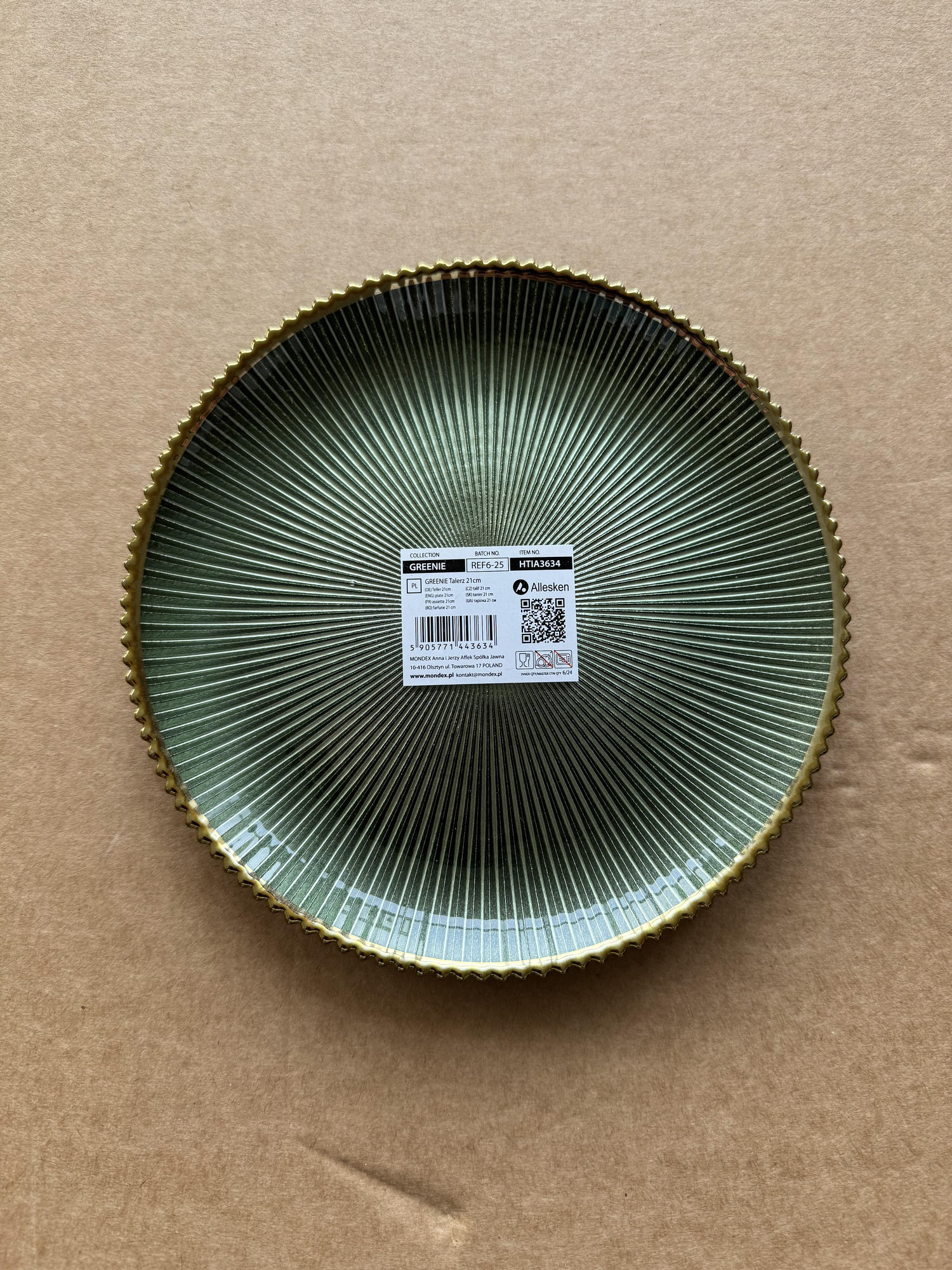 GREENIE. Talerz dekoracyjny szklany 21 cmSzlachetna zieleń i elegancja natury na Twoim stoleTalerz GREENIE to połączenie prostoty i elegancji z wyraźnym nawiązaniem do natury. Wykonany z wysokiej jakości szkła, o średnicy 31 cm, prezentuje się niezwykle efektownie dzięki głębokiej, zielonej barwie, która przyciąga uwagę i nadaje wyjątkowego charakteru każdej aranżacji stołu.Delikatnie lśniąca powierzchnia oraz klasyczny, okrągły kształt sprawiają, że talerz świetnie sprawdza się zarówno jako naczynie użytkowe, jak i element dekoracyjny . np. baza pod stroiki, świece, ciasta czy kompozycje sezonowe. Jego uniwersalny styl wpisuje się w estetykę wnętrz rustykalnych, nowoczesnych i boho.Przeznaczenie:do serwowania ciast, owoców, przystawek lub jako paterajako ozdobna podstawa pod świeczniki, dekoracje świąteczne lub florystycznedo codziennego użytku i na specjalne okazje Cechy produktu:Średnica: 21 cmMateriał: szkłoKolor: intensywna zieleń z lekkim połyskiemStyl: naturalny, elegancki, dekoracyjnyCzyszczenie: zaleca się mycie ręczne, dla zachowania trwałości koloru i połysku. Talerz GREENIE to ponadczasowa propozycja dla osób ceniących estetykę inspirowaną naturą, styl i funkcjonalność w jednym.