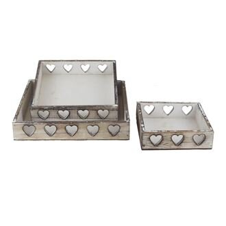 Sada dekoračních podnosů se srdíčky.Sada obsahuje 3 podnosy o třech velikostech.Malý podnos má rozměry : 15 x 15 cm, výšku 4 cm.Střední podnos má rozměry : 20 x 20 cm, výšku 4 cm.Velký podnos má rozměry : 25 x 25 cm, výšku 4 cm.