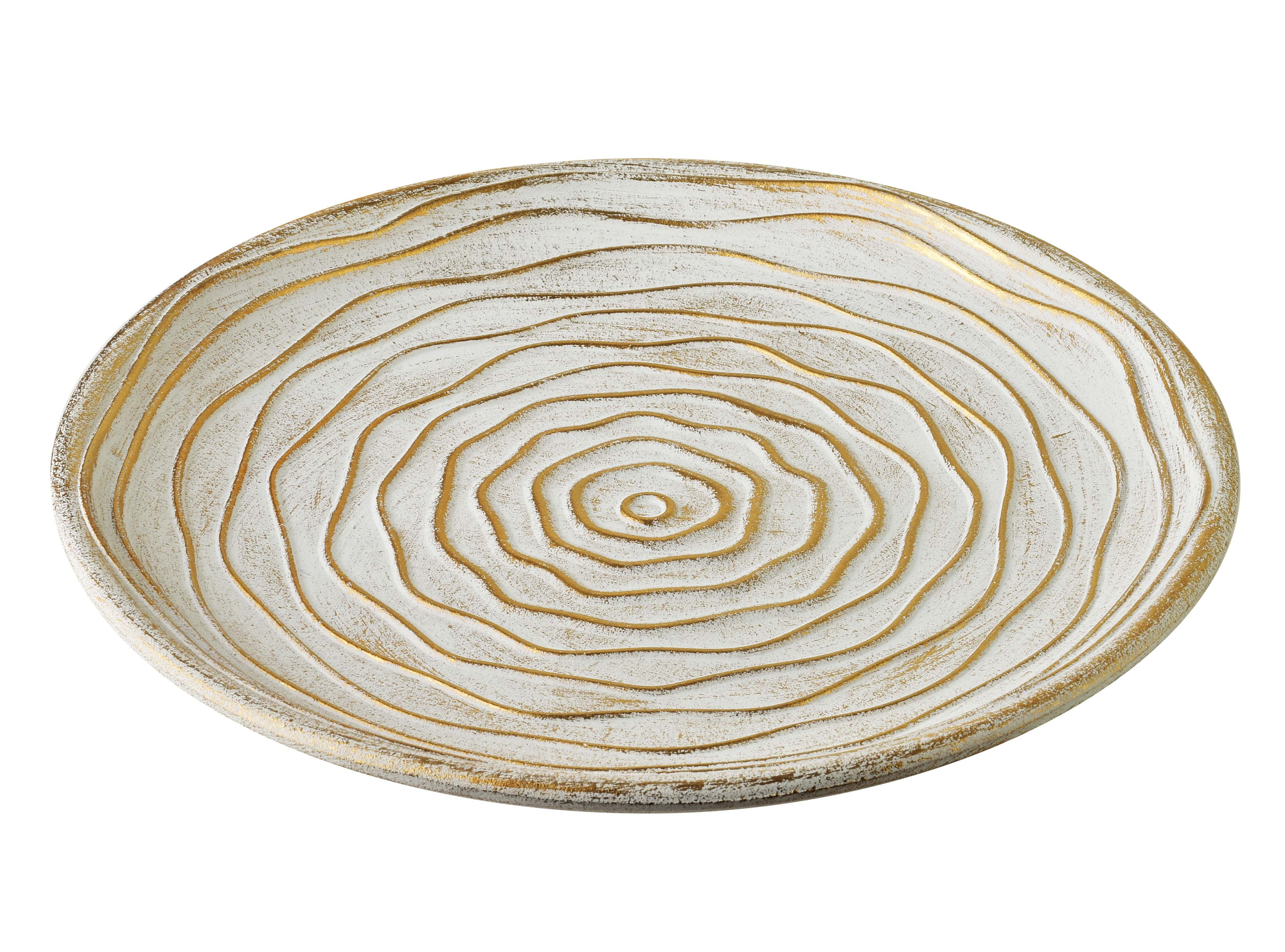 DAZ Taca dekoracyjna okrągła 29 29 3,5 cm, biała ze złotym przetarciemStylowa taca dekoracyjna z kolekcji DAZ marki MONDEX . since 1986.Wykonana z wysokiej jakości MDF-u w kolorze białym ze złotym przetarciem, które nadaje jej subtelnego, eleganckiego charakteru.Powierzchnia tacy ozdobiona jest tłoczeniem w nieregularne linie, co tworzy ciekawy, nietypowy efekt wizualny.Doskonale sprawdzi się jako element dekoracyjny stołu, komody lub toaletki, idealna do ekspozycji świec, ozdób lub biżuterii. Nie nadaje się do kontaktu z żywnością.