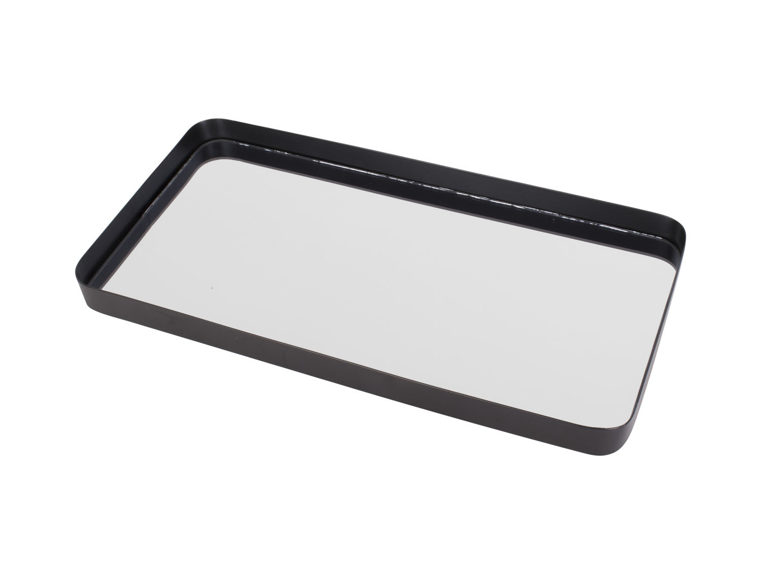 Zrcadlový kovový obdélníkový tác ve stříbrné barvě.