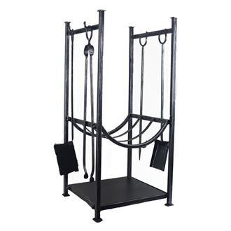 Stojan na dřevo s příslušenstvím.Stojan obsahuje : lopatku, metličku, hák, kleště.Stojan má rozměry : 34 x 34 cm, výšku 75 cm.Barva : kombinace černá, stříbrná.Materiál : kov. číst celé