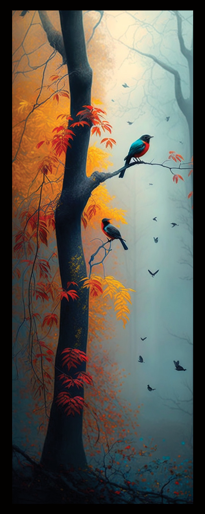 Tato záložka zachycuje melodii podzimu - rozlité mléko, tmavé kmeny stromů a barevné listí, které tvoří dechberoucí scénu. Červenky usedlé na větvičkách červenolístých stromů sledují, jak se les připravuje na příchod chladného období. Elegantní kombinace červených a zlatých tónů dělá z této záložky jedinečný doplněk, který potěší každého milovníka přírody a podzimní romantiky.