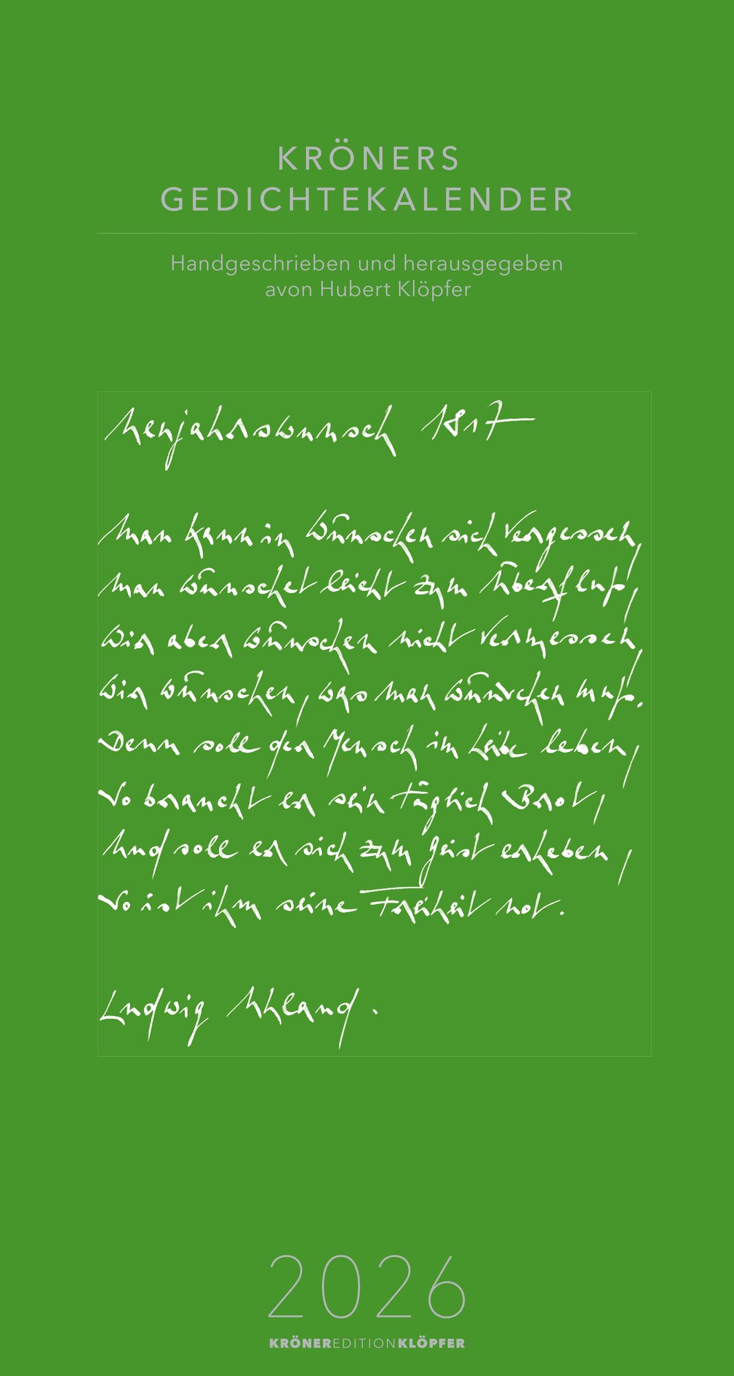 Der handschriftliche Gedichtekalender von Hubert Klöpfer für 2025.Das sind - außer dem attraktiven Deckblatt - 24 Gedichtblätter in faksimilierter Abschrift. Und mit einer Extraseite dazu: alle Gedichte auch in 'Klarschrift', in zweifelsfrei lesbarem Schriftsatz. Ein besonderer Kalender für...