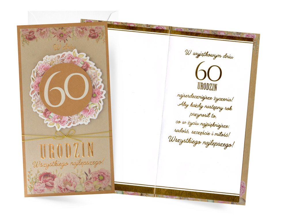 Kartka "W dniu 60 urodzin" z serii Passion Moments PM-417Każda kartka w kolekcji Passion Moments to małe arcydzieło - wyjątkowe i niepowtarzalne, piękne wizualnie. Kartki PM są bardzo bogato zdobione, a jednocześnie skromne i stylowe, cały efekt tkwi w detalach i doskonałym wykonaniu. W zależności od wzoru, na kartkach znajdują się dekoracje ze złotej, srebrnej, perłowej lub holograficznej folii, a także doklejki biżuteryjne, kokardki, laserowe wycięcia, wstążeczki i inne dodatki. Wnętrze karnetu to zawsze atrakcyjna grafika i tekst życzeń. Kartki mają w komplecie dopasowaną kopertę.Cechy szczególne:zdobienie: przynajmniej dwie folie (metaliczne/perłowe/holograficzne), elementy doklejane, wycięcia laserowe, wstążeczki - w zależności od wzoru,wnętrze: z delikatną grafiką, wyjątkowe życzenia w środku,w komplecie: dopasowana kolorystycznie koperta,wymiary karnetu po złożeniu: 11,4 x 21,5 cm.okazja: urodziny