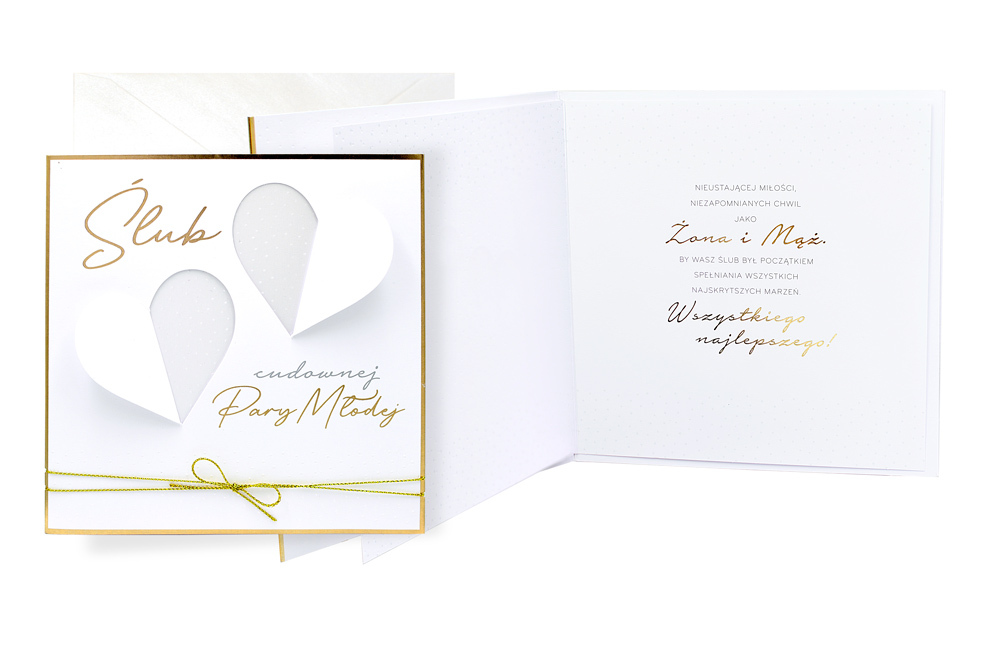Kartka Primus 0242 na ŚlubKartki z serii Primus, to kartki najwyższej jakości, pięknie zdobione m.in złotą lub srebrną folią, tłoczeniami, czy wycinkami laserowymi.W środku każdej kartki znajdują się dobrane do okazji życzenia, a do kartki dołączona jest dopasowana koperta.Cechy szczególne:wymiary: 175 x 175 mm (po złożeniu)zdobienia: dekoracje ze złotej folii, doklejane koraliki, tłoczeniakoperta: dopasowana w komplecie,wnętrze kartki: życzenia w środku,okazja: Ślub