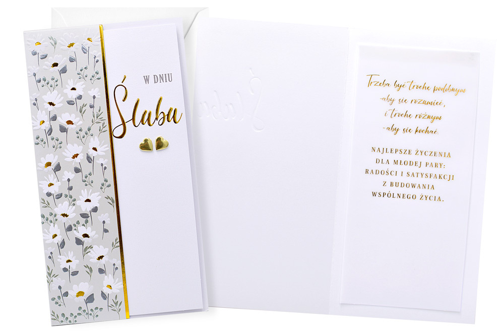 Kartka z okazji Ślubu z serii Passion Moments PM-436Każda kartka w kolekcji Passion Moments to małe arcydzieło - wyjątkowe i niepowtarzalne, piękne wizualnie. Kartki PM są bardzo bogato zdobione, a jednocześnie skromne i stylowe, cały efekt tkwi w detalach i doskonałym wykonaniu. W zależności od wzoru, na kartkach znajdują się dekoracje ze złotej, srebrnej, perłowej lub holograficznej folii, a także doklejki biżuteryjne, kokardki, laserowe wycięcia, wstążeczki i inne dodatki. Wnętrze karnetu to zawsze atrakcyjna grafika i tekst życzeń. Kartki mają w komplecie dopasowaną kopertę.Cechy szczególne:zdobienie: przynajmniej dwie folie (metaliczne/perłowe/holograficzne), elementy doklejane, wycięcia laserowe, wstążeczki - w zależności od wzoru,wnętrze: z delikatną grafiką, wyjątkowe życzenia w środku,w komplecie: dopasowana kolorystycznie koperta,wymiary karnetu po złożeniu: 11,4 x 21,5 cm.okazja: Ślub