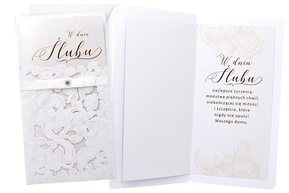 Kartka z okazji Ślubu z serii Passion Moments PM-439Każda kartka w kolekcji Passion Moments to małe arcydzieło - wyjątkowe i niepowtarzalne, piękne wizualnie. Kartki PM są bardzo bogato zdobione, a jednocześnie skromne i stylowe, cały efekt tkwi w detalach i doskonałym wykonaniu. W zależności od wzoru, na kartkach znajdują się dekoracje ze złotej, srebrnej, perłowej lub holograficznej folii, a także doklejki biżuteryjne, kokardki, laserowe wycięcia, wstążeczki i inne dodatki. Wnętrze karnetu to zawsze atrakcyjna grafika i tekst życzeń. Kartki mają w komplecie dopasowaną kopertę.Cechy szczególne:zdobienie: przynajmniej dwie folie (metaliczne/perłowe/holograficzne), elementy doklejane, wycięcia laserowe, wstążeczki - w zależności od wzoru,wnętrze: z delikatną grafiką, wyjątkowe życzenia w środku,w komplecie: dopasowana kolorystycznie koperta,wymiary karnetu po złożeniu: 11,4 x 21,5 cm.okazja: Ślub