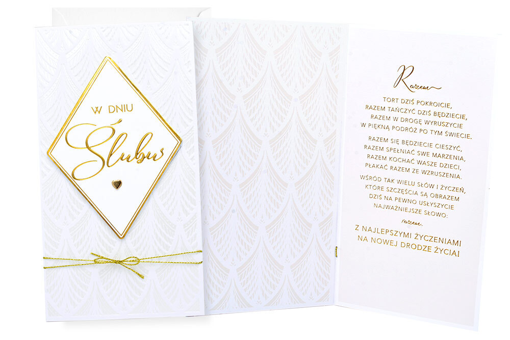Kartka z okazji Ślubu z serii Passion Moments PM-434Każda kartka w kolekcji Passion Moments to małe arcydzieło - wyjątkowe i niepowtarzalne, piękne wizualnie. Kartki PM są bardzo bogato zdobione, a jednocześnie skromne i stylowe, cały efekt tkwi w detalach i doskonałym wykonaniu. W zależności od wzoru, na kartkach znajdują się dekoracje ze złotej, srebrnej, perłowej lub holograficznej folii, a także doklejki biżuteryjne, kokardki, laserowe wycięcia, wstążeczki i inne dodatki. Wnętrze karnetu to zawsze atrakcyjna grafika i tekst życzeń. Kartki mają w komplecie dopasowaną kopertę.Cechy szczególne:zdobienie: przynajmniej dwie folie (metaliczne/perłowe/holograficzne), elementy doklejane, wycięcia laserowe, wstążeczki - w zależności od wzoru,wnętrze: z delikatną grafiką, wyjątkowe życzenia w środku,w komplecie: dopasowana kolorystycznie koperta,wymiary karnetu po złożeniu: 11,4 x 21,5 cm.okazja: Ślub