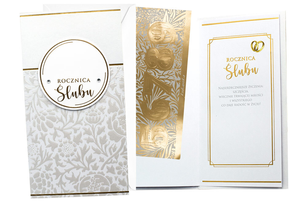 Kartka na Rocznicę ślubu z serii Passion Moments PM-334Każda kartka w kolekcji Passion Moments to małe arcydzieło - wyjątkowe i niepowtarzalne, piękne wizualnie. Kartki PM są bardzo bogato zdobione, a jednocześnie skromne i stylowe, cały efekt tkwi w detalach i doskonałym wykonaniu. Kartki z tej serii mają wyjątkowy dodatek - naklejki z cyframi, z których można ułożyć dowolną Rocznicę Ślubu. W zależności od wzoru, na kartkach znajdują się dekoracje ze złotej, srebrnej, perłowej lub holograficznej folii, a także doklejki biżuteryjne, kokardki, brokat, laserowe wycięcia, wstążeczki i inne dodatki. Wnętrze karnetu to zawsze atrakcyjna grafika i tekst życzeń. Kartki mają w komplecie dopasowaną kopertę.Cechy szczególne:zdobienie: przynajmniej dwie folie (metaliczne/perłowe/holograficzne), brokat, elementy doklejane, wycięcia laserowe, wstążeczki - w zależności od wzoru,wnętrze: z delikatną grafiką, wyjątkowe życzenia w środku,w komplecie: dopasowana kolorystycznie koperta,okazja: Rocznica ślubuWymiary karnetu po złożeniu: 11,4 x 21,5 cm.