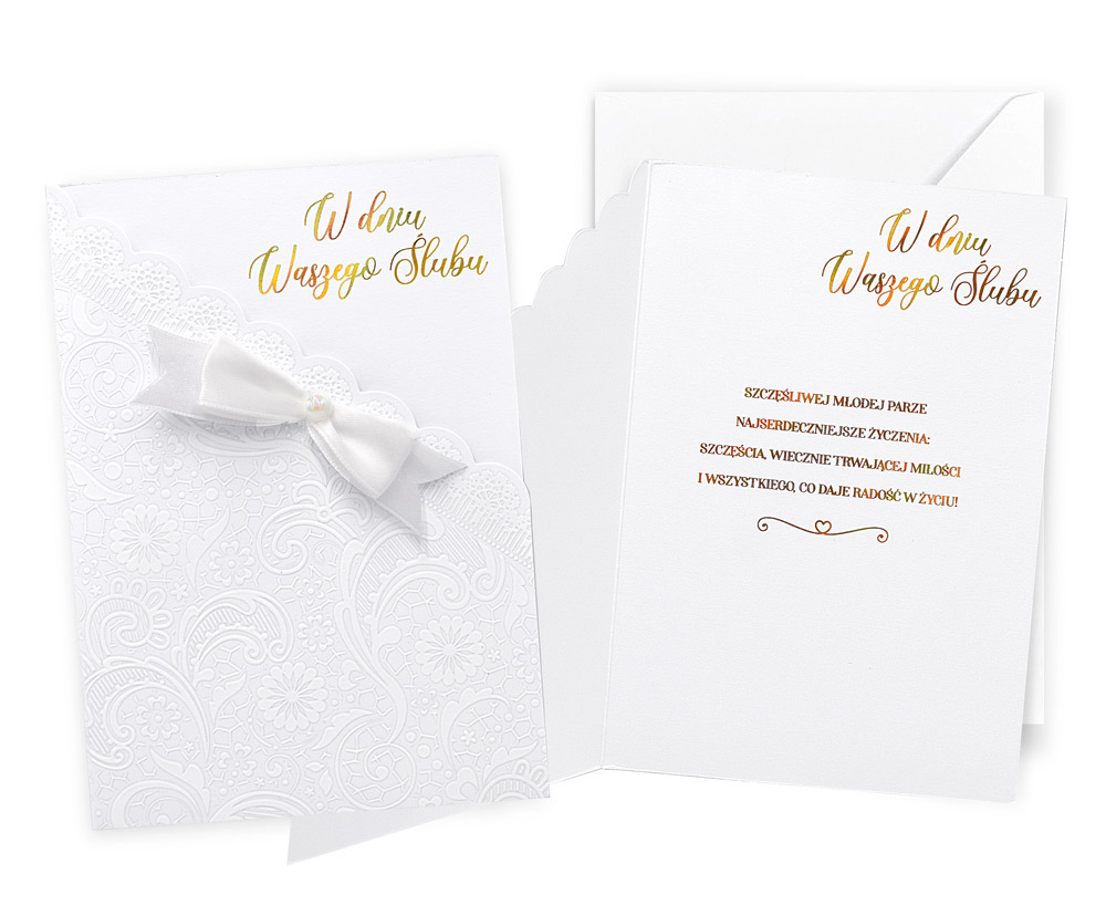 Kartka Dream Cards na Ślub DK-1328Kartka B6 z ozdobnej serii Dream Cards - nieduża, ale robi wrażenie dzięki atrakcyjnej kolorystyce i ciekawym zdobieniom.To idealny wybór łączący przyjazną cenę z jakością.Cechy szczególne:wielkość: B6, 16.6 x 11.7 cm po złożeniu,koperta: w zestawie, kolorowa,zdobienia: kolorowe, różnorodne, bogate (w zależności od wzoru: przyklejane dekoracje, elementy biżuteryjne, odstawniki, metaliczne folie, tłoczenia itp.),okazja: Ślub