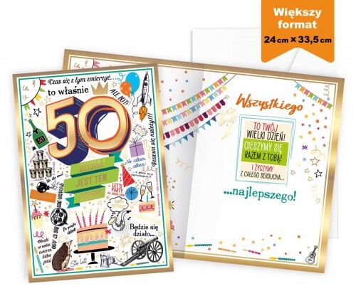 Duża kartka Prestige "Urodziny 50" P-040. Duże jest lepsze - każdy to wie! Dlatego imponujących rozmiarów kartka Prestige zawsze robi wrażenie i wyróżnia się wśród innych. Zdobiony srebrną folią w nowoczesnym stylu, duży i piękny Prestige to naprawdę coś. Kazda kartka z serii Prestige jest kolorowa w środku i ma w komplecie dopasowaną kopertę. Wewnątrz kartki jest sporo miejsca, idealnie nadaje się więc na wspólny prezent dla większej grupy osób - każdy będzie miał dość miejsca, aby podpisać się pod życzeniami lub dodać zabawny rysunek od siebie :) Cechy szczególne: wielkość: B4, 25 x 35 cm po złożeniu, koperta: dopasowana w zestawie, zdobienia: dekoracje ze srebrnej folii metalicznej, wnętrze kartki: kolorowe, z życzeniami, okazja: urodziny 50, pięćdziesiątka