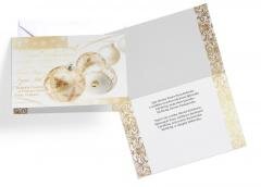 Kartka wielkości B6, zdobiona w zależności od wzoru metaliczną folią lub brokatem. Każda kartka posiada kolorowe życzenia w środku i koperte.