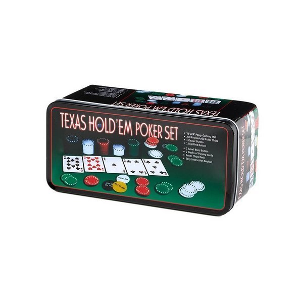 Balení obsahuje:- plechový box s praktickým úložným prostorem pro žetony- pokerové plátno o rozměrech cca. 58 x 90 cm2- 2 balíčky kartonových karet- 200 kusů žetonů v pěti barevných provedeních- 3 základní buttony: dealer, small blind, big blind- stručný návod ke hře Texas Hold´em No Limit.