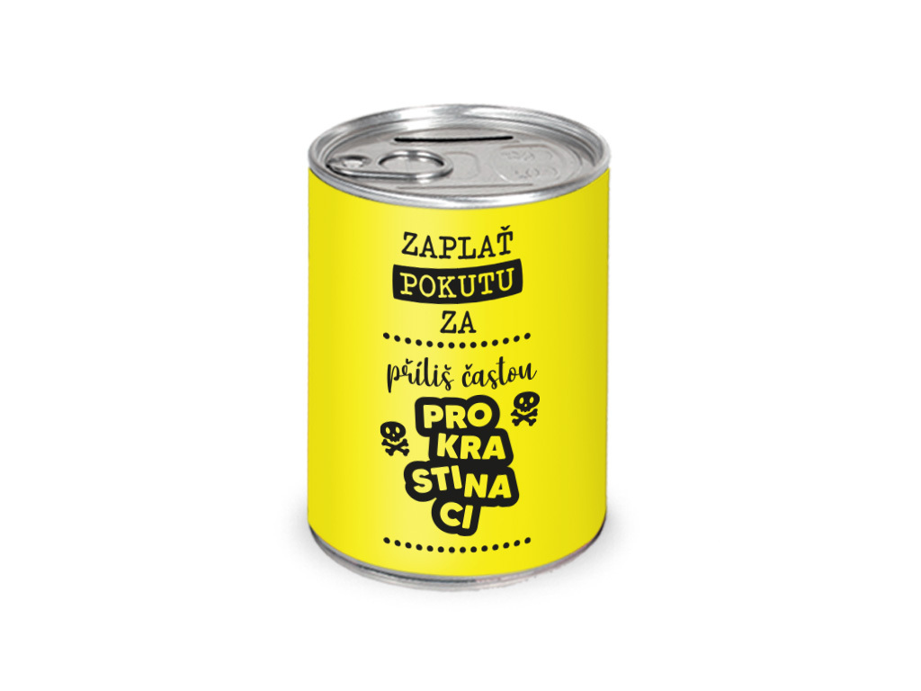 Humorná pokladnička s textem "Zaplať pokutu za příliš častou prokrastinaci".