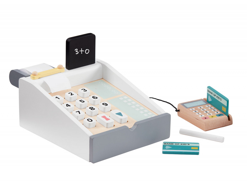 Pokladna v dřevěném provedení je nezbytným doplňkem dětského obchodu. Pokladna je vybavena mačkacími tlačítky s čísly, černou tabulkou s křídou pro psaní ceny, čtečkou platebních karet a zásuvkou na peníze.