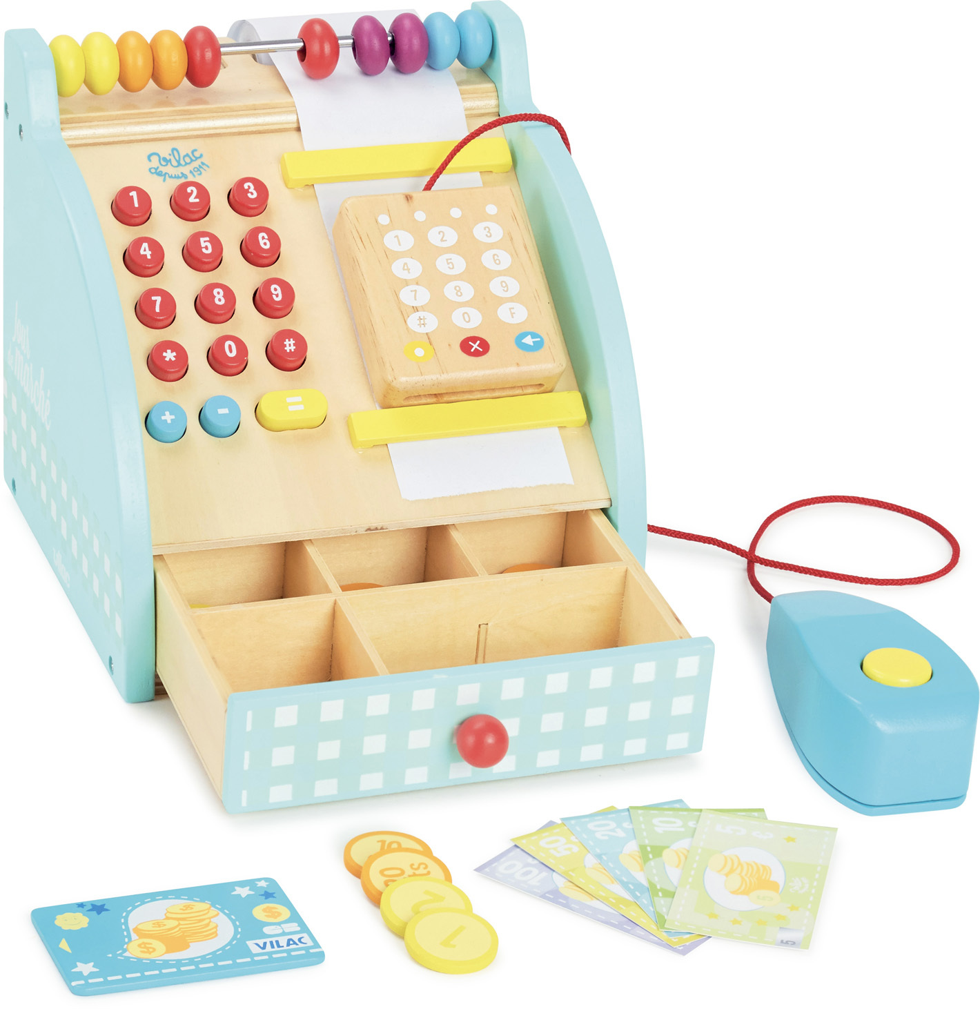 Dřevěná pokladna s šuplíkem na peníze, počítadlem a bankovním terminálem. Obsahuje také klasické zvukové tlačítko a funkční numerickou klávesnici. Mezi doplňky patří bankovky a mince. Hračky Vilac mají značku francouzské agentury ADEME, to znamená, že tyto dřevěné hračky jsou vyráběny ekologicky. Šetří životní prostředí, neznečišťují půdu, vodu a vzduch, neplýtvají energiemi. Již více než 100 let plní značka Vilac dětské sny. Společnost Vilac sídlí hluboko v srdci pohoří Jura, obklopena horami, jezery a lesy. Tato francouzská společnost vyrábí od roku 1911 dřevěné hračky v klasickém, starodávném stylu s moderními barvami a vzory. Hračky Vilac jsou jedinečné, nikdy nevyjdou z módy a dokáží okouzlit všechny generace. Vilac pomáhá utvářet dětskou představivost svými radostnými ilustracemi či dizajny a reinterpretací klasických hraček, které se jen tak neopotřebují. Děti dostávají na Vánoce a narozeniny spousty hraček, většina z nich je však nezaujme na dlouhou dobu, láska k hračce se nenaplní. Dřevěné hračky Vilac vzbuzují vášeň i o 50 let později, když jako dospělí náhodou najdete v podkroví hračky, které jste jako děti milovali. Vilac již 100 let propojuje děti s hračkami, které si oblíbí a váží si jich. A proč je děti tak milují? To zůstává tajemstvím firmy Vilac.