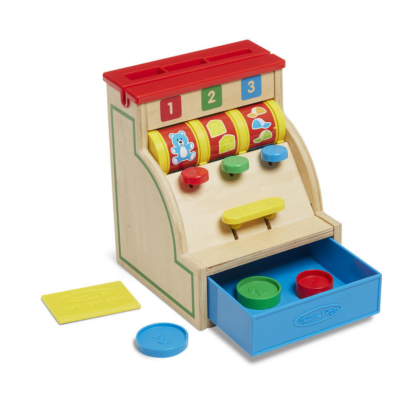 Zmáčknutím jednotlivých páček se roztočí display se zbožím. Potřebujete vrátit peníze? Stačí zmáčknout spodní páčku.Zákazník platí kartou? I to je u nás možné!Pokladna je vyrobena z kvalitního dřeva a plastových doplňků.Rozměry balení: 17 x 26 x 17 cm.Vhodné pro děti od 3 let.