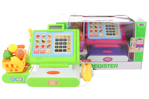 Plastová elektronická pokladna na baterie. Pokladna má vysunovací šuplík na peníze, váhu, čtečku karet a snímač čárových kódů. Pokladna vydává zvuky, svítí a umí počítat. Součástí jsou také peníze, košík a potraviny. Napájení na 3 AA baterie (nejsou součástí). Rozměry pokladny cca 31 x 19 cm. Rozměry balení cca 40 x 23,5 x 20 cm. Věk 3+