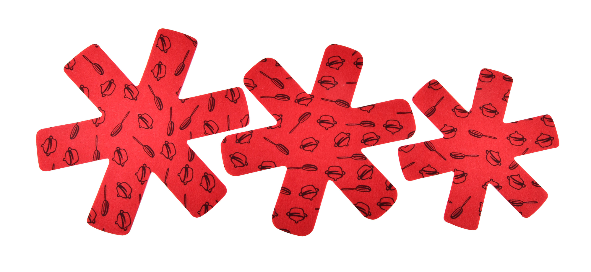 Komplet czerwonych przekładek do patelni/garnków 3szt. marki COOKINI by MONDEX. Wykonane z filcu z wzorem w garnki i patelnie w kolorze czarnym. Innowacyjne przekładki chronią przechowywane patelnie z powłoką typu non-stick przed zarysowaniem, gdy są ułożone jedna na drugiej. Zestaw składa się z przekładek o średnicach 35 cm, 33 cm, 28 cm. Mogą one również posłużyć do przechowywania garnków bądź naczyń żaroodpornych. Zaleca się pranie ręczne. zapakowany w folię: 36.5x37.5x0.20cm