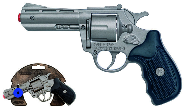 Vyrobený s precizností ve Španělsku, policejní revolver v elegantním stříbrném provedení nabízí realistický vzhled a pocit díky kovové konstrukci. Jeho velikost 16,5×10,5 cm je ideální pro pohodlné držení v ruce a manipulaci. Revolver je vybaven osmi komorami na kapslíky, díky čemuž při použití vydává autentický zvukový efekt, který zvýší autentičnost každé hry.