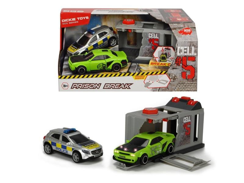 Vězeňská cela se zakódovaným zámkem a tlačítkem pro únik, policejní auto Mercedes na volnoběh a auto Dodge Hellcat Villain se světelnými a zvukovými efekty a speciálním bouracím efektem.