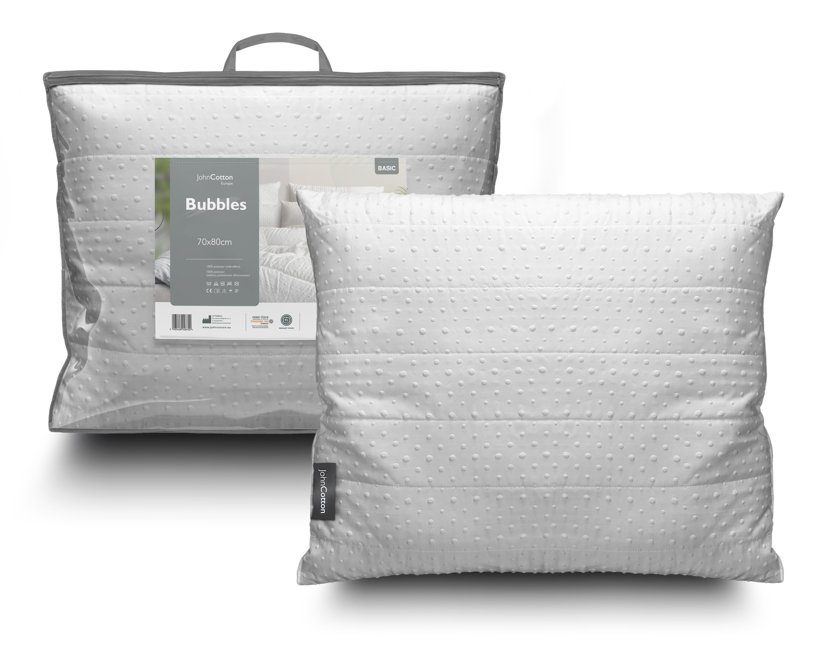 Kvalitní prošívaný polštář BUBBLES v rozměru 70x80 cm s optimálními izolačními vlastnostmi je vhodný pro alergiky. Povrch je měkký, elastický a pružný s velkou odolností. Polštář je vyrobený z mikrovlákna s reliéfem bublinek. Výplň dokonale propouští vzduch, zabraňuje vnikání prachových roztočů a usazování prachu. Je vyrobený ve vysoké kvalitě a lze ho prát v automatické pračce při 60°C. Praní na 60°C zaručuje vysoký hygienický standard, ničí plísně, bakterie a roztoče.