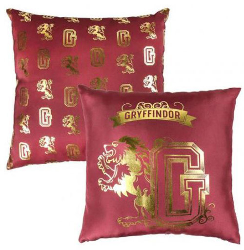 Červeno-zlatý polštář s grafikou Gryffindor.