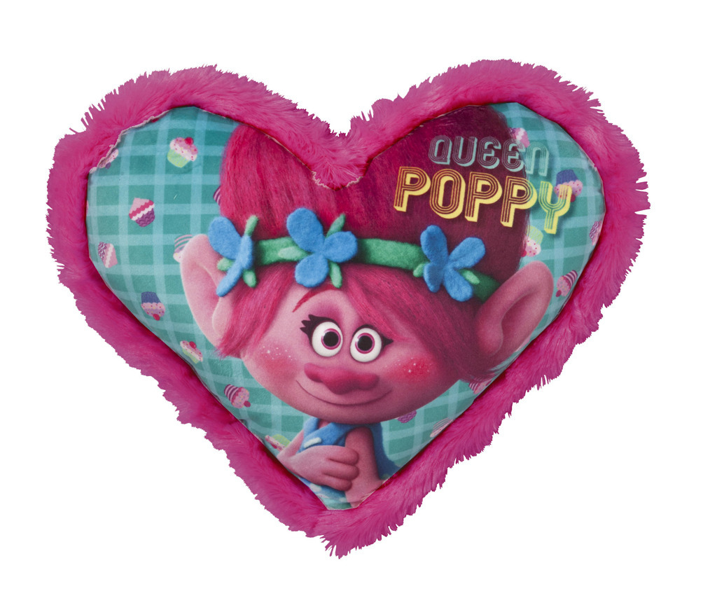 Měkký polštářek s motivem oblíbených postaviček Trollů s nápisem Queen Poppy ve tvaru srdce o velikosti 33 cm.
