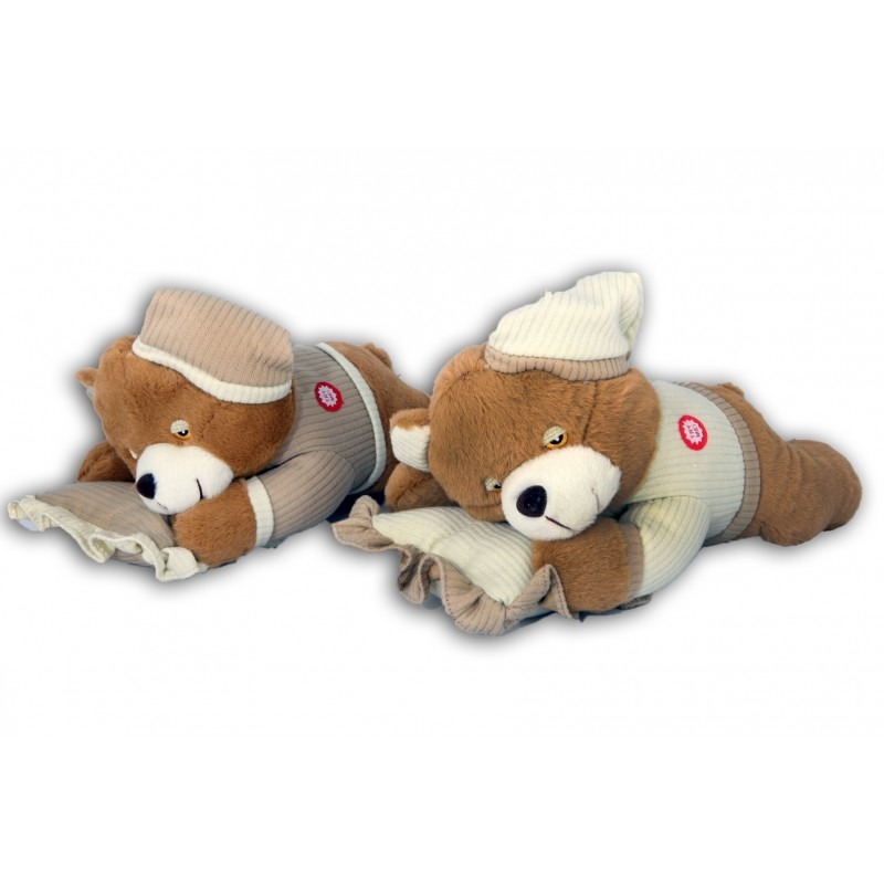 Plyšový medvídek 30 cm spící na měkkém polštáři - dvě barvy. Po zmáčknutí červeného tlačítka medvídek začne chrápat.
