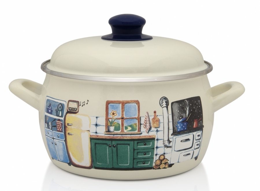 Tento smaltovaný hrnec je nejen krásným doplňkem vaší kuchyně, ale i spolehlivým pomocníkem při vaření. Díky decentní béžové barvě a malbě typické venkovské kuchyňky působí hrnec velmi příjemně a útulně, což vám zpříjemní každý den strávený u plotny. Připomene vám atmosféru kuchyní vašich dědečků a babiček nebo chalupu, kde se vařilo s láskou a s citem pro tradici.