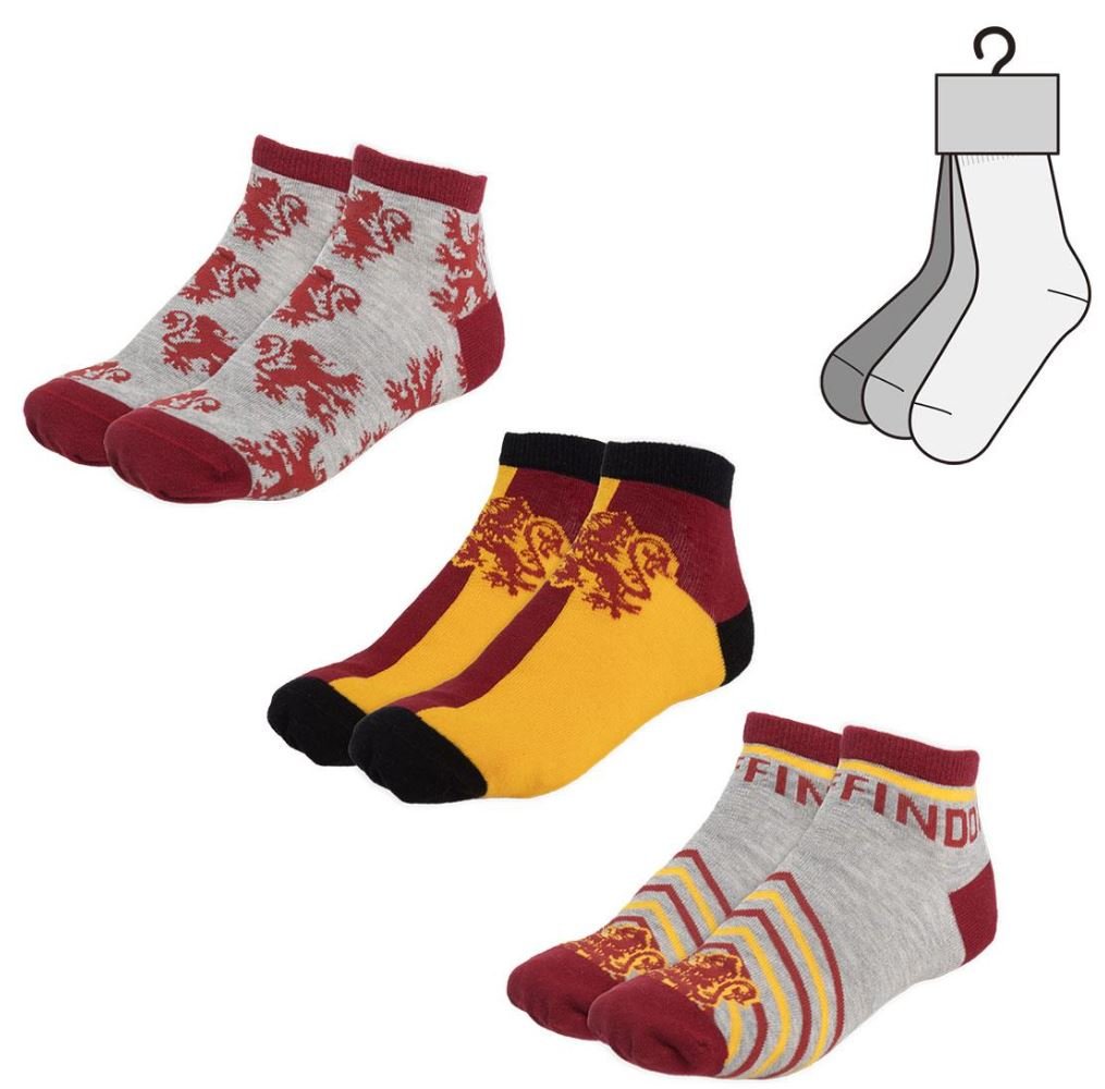 Set 3 různě barevných párů ponožek se znakem a motivy koleje Gryffindor (Nebelvír) z filmové série Harry Potter.