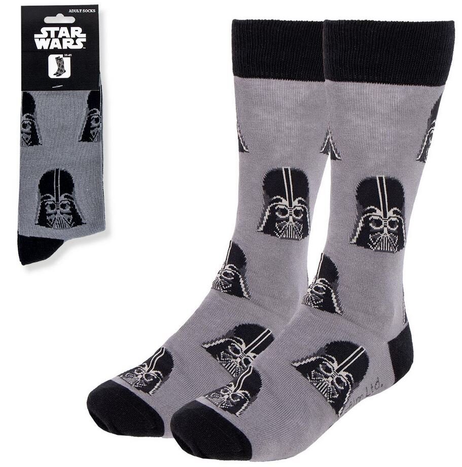 Pár šedých ponožek s černými detaily a černým znakem Darth Vader. V univerzální velikosti EU 38-45 pro dospělé.