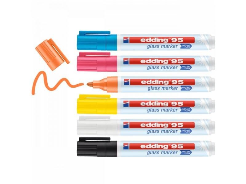 Popisovač EDDING 95 v sadě 6 ks je ideální pomocník pro všechny, kdo chtějí psát, kreslit nebo označovat na skle, zrcadlech či bílých tabulích. Díky své vynikající krycí schopnosti a zářivým barvám vaše stopy nezůstanou bez povšimnutí ani na barevném skle.