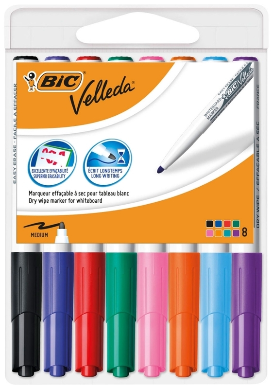 Markery suchościeralne BiC Velleda vám zajistí jasné, barevné a snadno odstranitelná písma na jakoukoli bílou tabuli. Díky sadě osmi pestrých barev bude vaše komunikace nejen přehledná, ale i atraktivní.