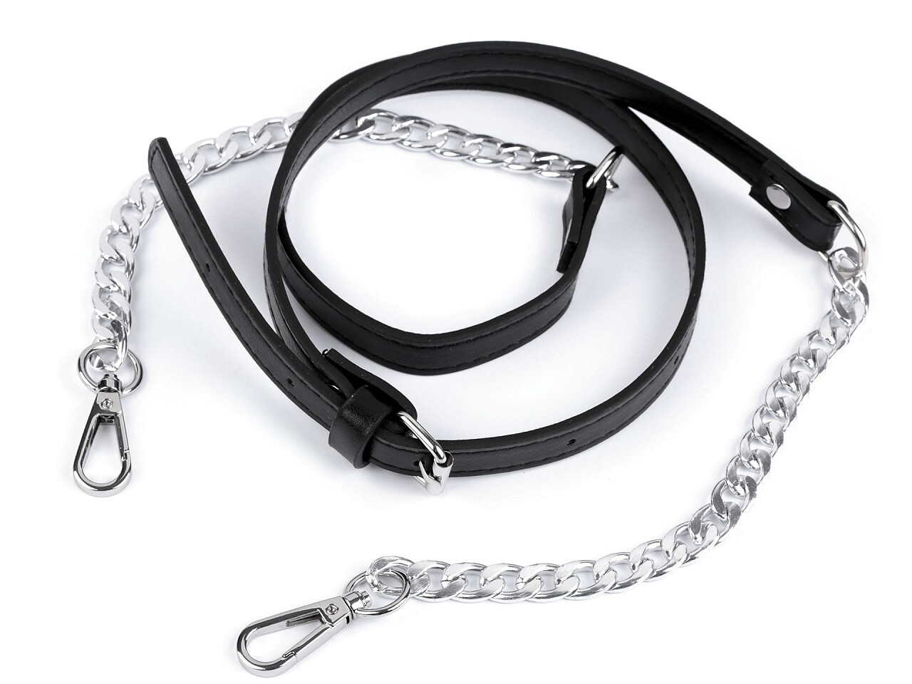 Koženkový popruh / ucho na kabelku s řetízkem a karabinami šíře 1,5 cm - 1 ks - 1 černá nikl