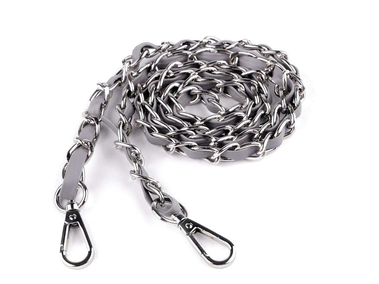 Kovový řetízek je efektně propletený řemínkem z eko kůže. Využijete ho na menší kabelky, psaníčka nebo pouzdra na mobilní telefony. Na obou jeho koncích najdete připevněné karabinky.Řetízek není určený na velkou zátěž.
