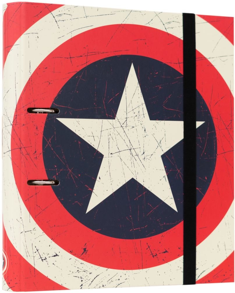 Oficiální kroužkový pořadač ve formátu A4 a doplňkové zboží z katalogu kancelářských produktů s logem a grafikou populárního superhrdiny Captain America od společnosti Marvel.