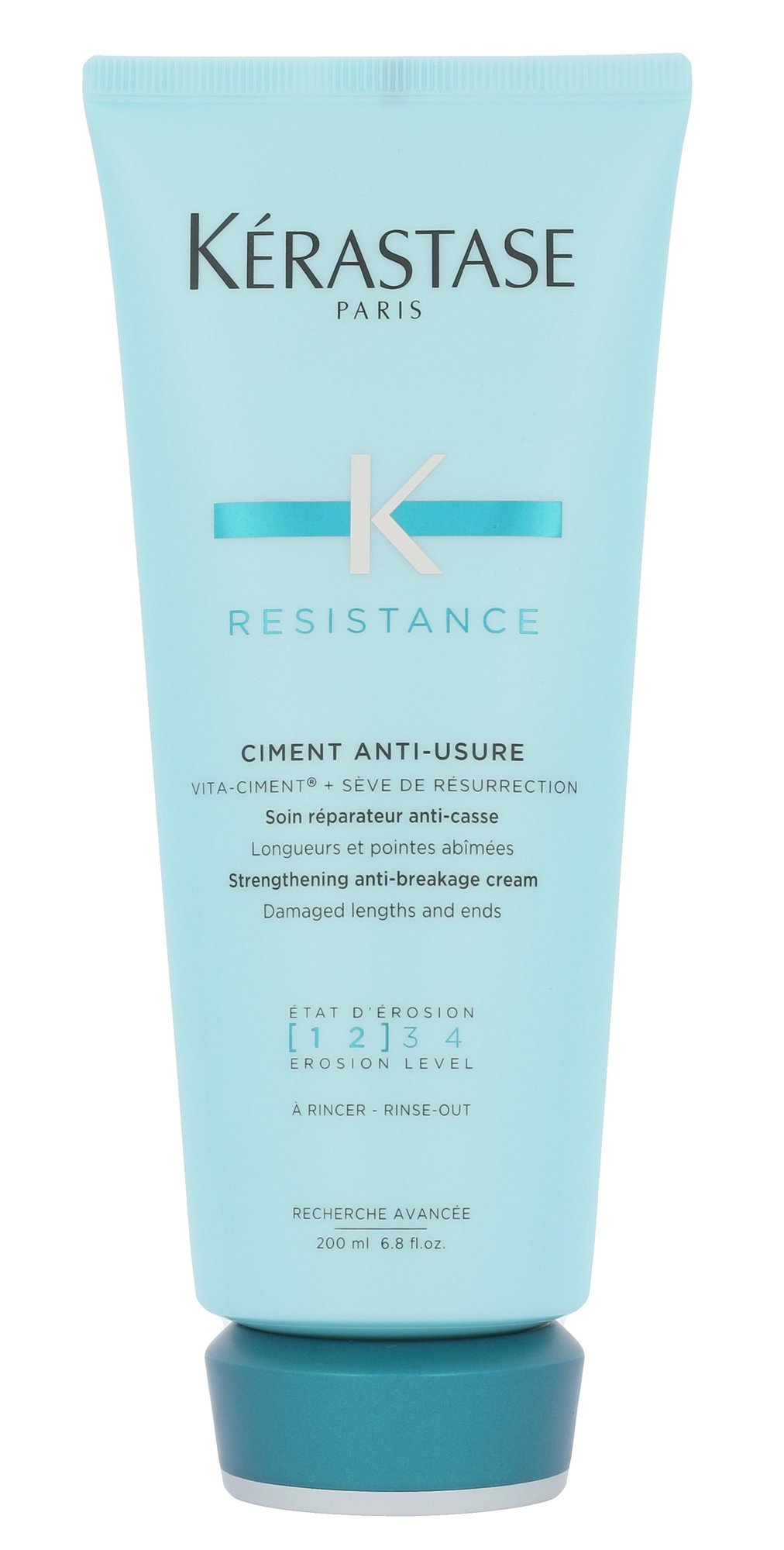 Balzám na vlasy **Kerastase Resistance Ciment Anti Usure** Blazám vhodný pro oslabené vlasy a roztřepené konečky. Obnovující přípravek pro opotřebené a poškozené vlasy. Zanechává vlasy hladké, snadno rozčesatelné. Vlasy jsou měkké, ohebné a hladké. Ideální pro delší vlasy. **Použití**: Malé množství velikosti ořechu nanést na vlasy a za přidání malého množství vody vlasy masírovat. Poté důkladně opláchnout.