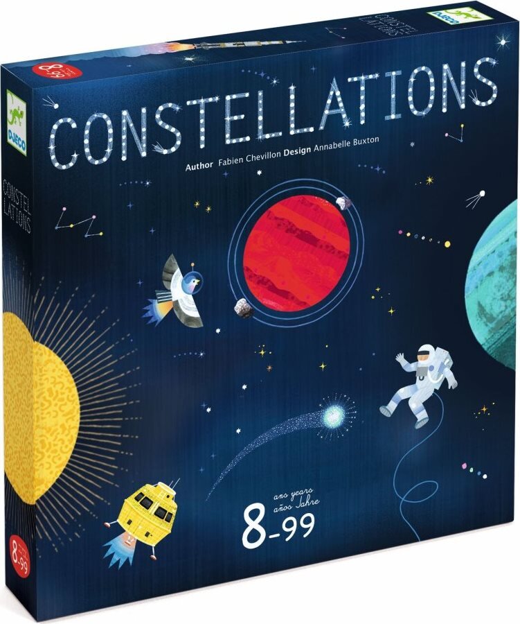 Dokážete najít cestu mezi hvězdami galaxie? Napínavá mezigalaktická hra Souhvězdí prověří vaše pozorovací schopnosti, prostorové vnímání a rychlost. Pravidla hry: Každý hráč má svou vlastní herní desku - galaxii a 6 karet souhvězdí. Jeden z hráčů hodí 3 kostkami a zvolí tak 3 typy planet. Hráči pak musí co nejrychleji položit své karty na svou galaxii tak, aby skrz otvory v každé kartě odhalili tyto 3 planety. Cílem hry je mít na konci 3. kola co nejvíce bodů. Hra obsahuje: 4 oboustranné herní desky - galaxie, 4 sady 6 karet souhvězdí, 3 kostky.