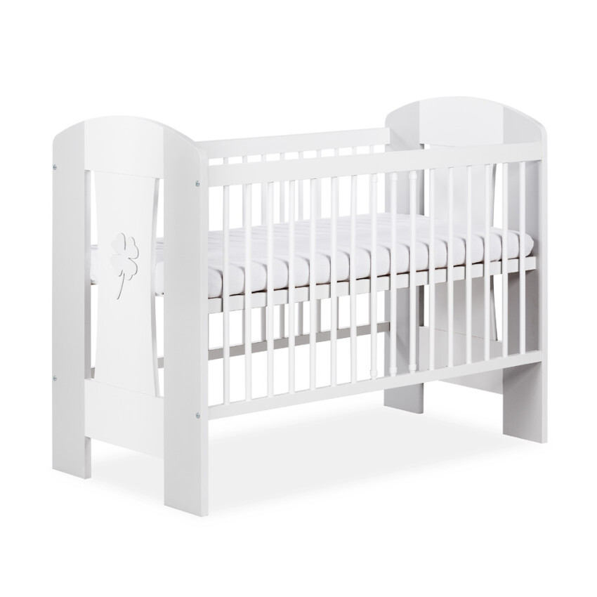 Łóżeczko Nati Koniczynka biały-popielwymiary:wewnętrzny: 120 x 60 cmzewnętrzny: 125 x 66 x 98 cmwysokości dna od podłoża: 21cm - 36cm - 51cmmateriały: płyta eko + płyta MDF + drewno sosnowe + sklejka liściasta3 poziomy wysokości dna łóżeczkaWyciągane szczeble
