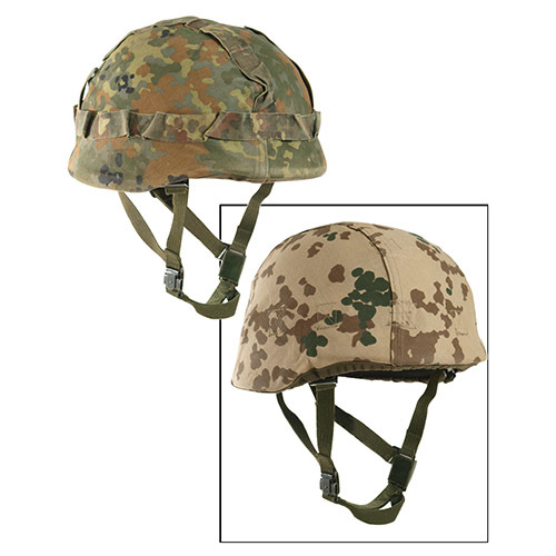 Oboustranný maskovací potah na Bundeswehr helmu. Z jedné standardní Flecktarn, z druhé pouštní Tropentarn. Použité zboží ve slušném stavu.