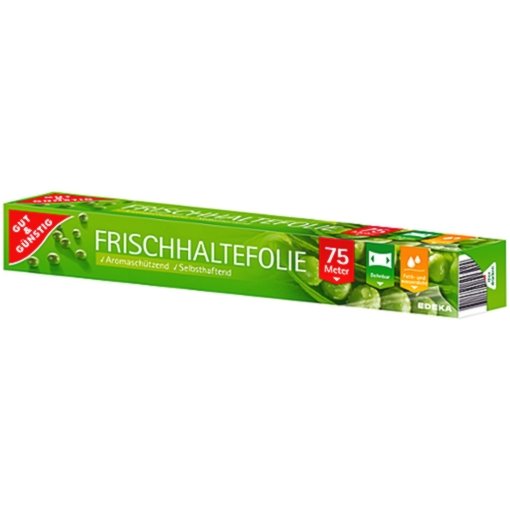 GG potravinová fólie - velikost 75m x 29cmkvalitní německá potravinová fólie, která zaručí delší trvandlivost uchovávaných potravin. Potravinová fólie 75m Rozměr: 29cm x 75m, Tloušťka 13µ Vhodné pro zakrytí a ochranu jídla všeho druhu. Udržuje potraviny déle čerstvé. Informace k životnímu prostředí: Fólie je vyrobena z recyklovatelného polyethylenu (PE). Při likvidaci neuvolňuje škodlivé látky do ovzduší, vody či země.
