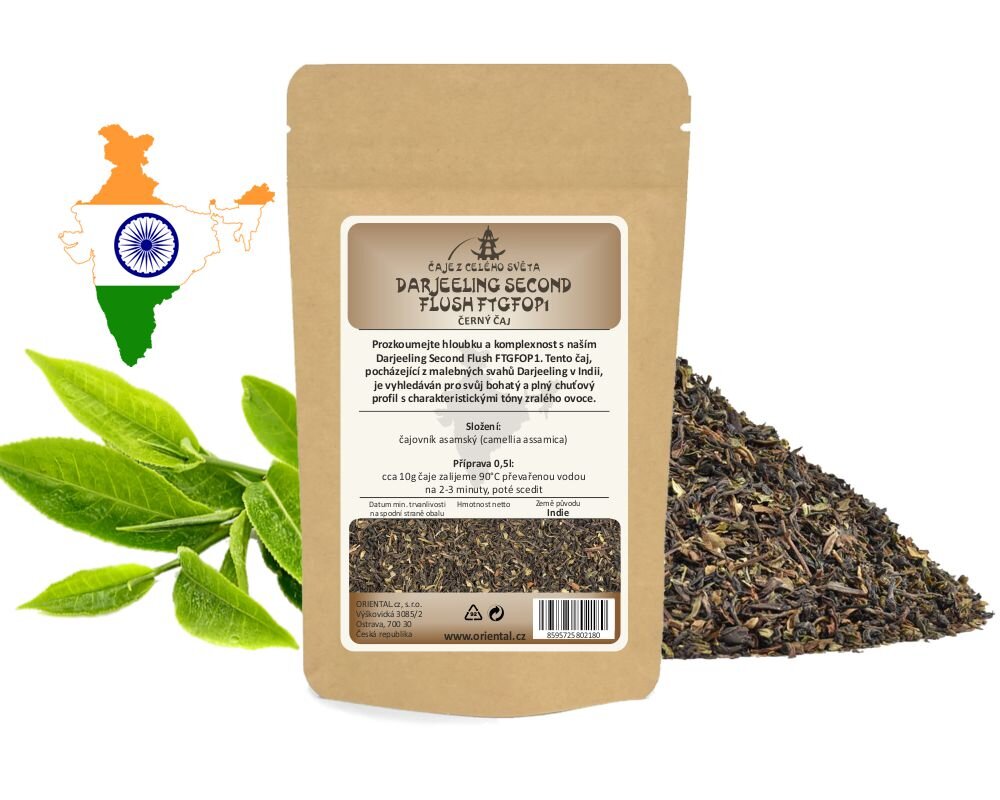 Prozkoumejte hloubku a komplexnost s naším Darjeeling Second Flush FTGFOP1, špičkovým indickým černým čajem, který pochází z druhé sklizně a je označen jako FTGFOP1 (Finest Tippy Golden Flowery Orange Pekoe 1), což značí jeho vynikající kvalitu. Tento čaj, pocházející z malebných svahů Darjeeling v Indii, je vyhledáván pro svůj bohatý a plný chuťový profil s charakteristickými tóny zralého ovoce.Darjeeling Second Flush FTGFOP1 je perfektní volbou pro milovníky černého čaje, kteří hledají hluboké a vyvážené chutě s bohatou arómou. Jeho jedinečný a rozmanitý chuťový profil činí tento čaj ideálním doplňkem jakéhokoli speciálního okamžiku nebo prostě jako luxusní každodenní indulgence.Příprava 10g čaje v 0,5l konvičce: