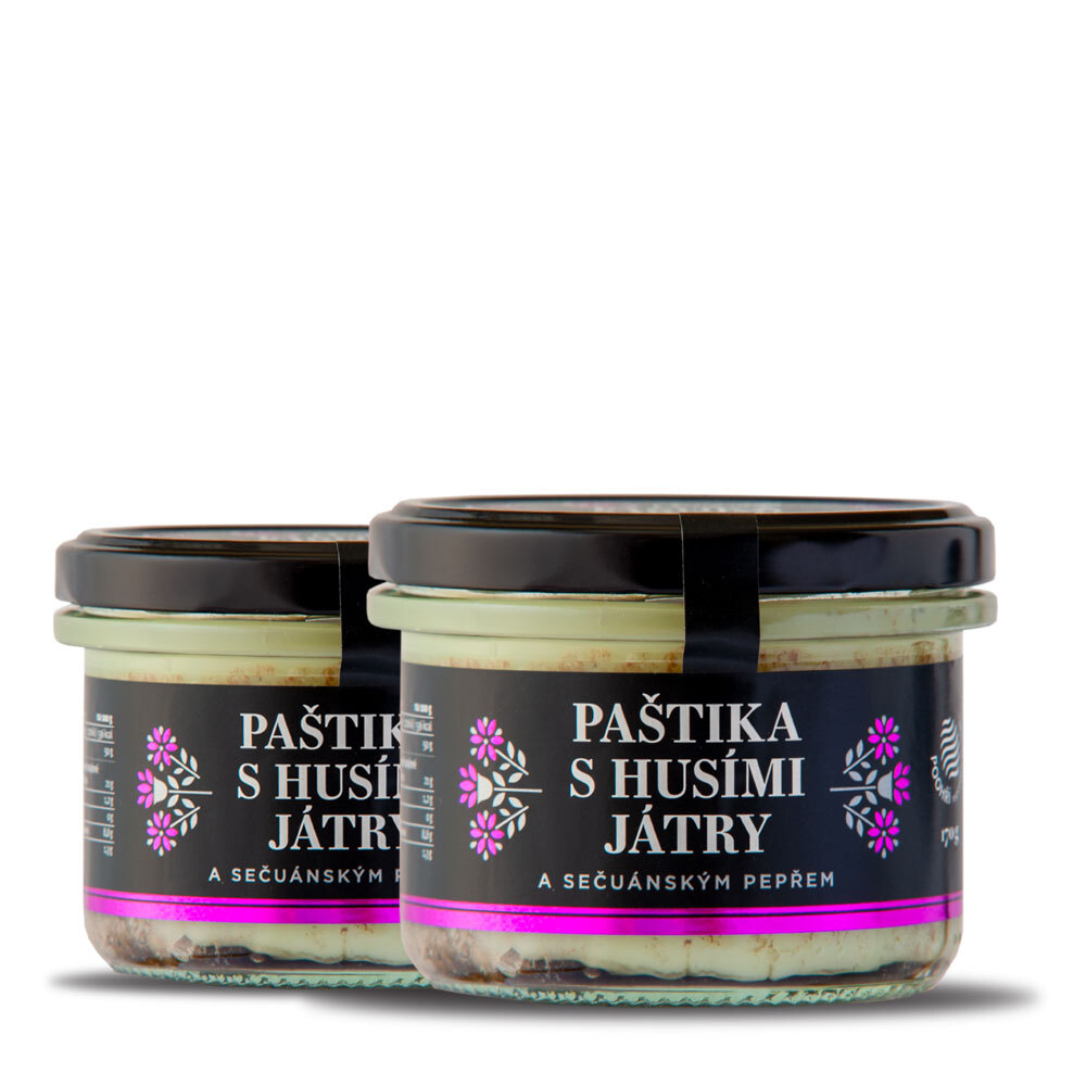 Složení: husí játra min. 30 %, vepřové sádlo, vepřové maso, brandy, jedlá sůl, směs koření, sečuánský pepř